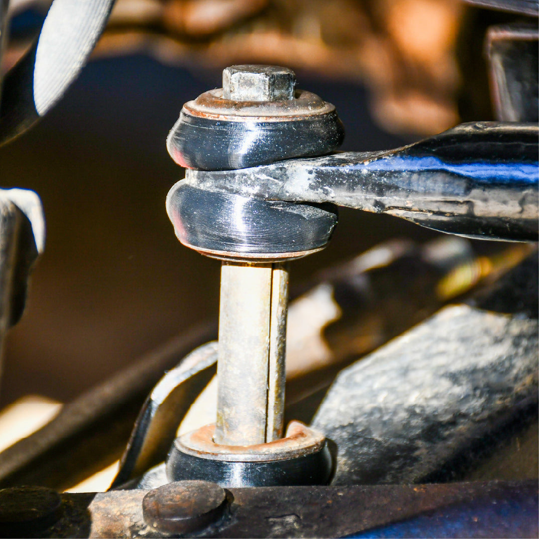 - Remount the LCA & caster/tension rod and fasten sway bar link bolt until all link bushes have your desirable tension loaded (bushes should be compressed and squished, ensure factory nyloc nut is still intact on the underside of the LCA connecting to the sway bar link bolt, this will prevent backing out).